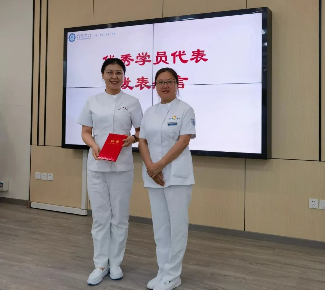 西安市中医医院李萌代表优秀学员发言,发言中表达了对医院、带教老师以及同事们的感谢,并分享了自己在培训期间的学习和成长经历,护理部任燕萍主任向李萌颁发了《优秀学员证书》。