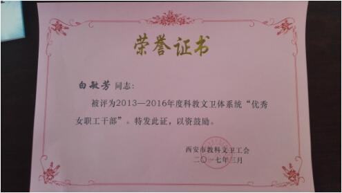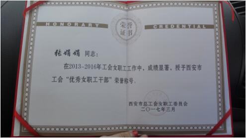 3月3日,市总工会纪念“三八”妇女节暨女职工建功立业表彰大会在大明宫剧院举行,我院护理部主任、女工委主任张娟娟荣获西安市工会“优秀女职工干部”荣誉称号。