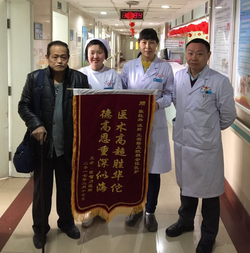 1月23日,经过充分的术前准备,张红兵和汪玲主任医师联手为患者实施了白内障超声乳化和玻璃体切割联合手术。经过一个星期的恢复治疗,患者左眼视力由术前的光感不确定达到术后的0.01,生活基本能够自理。患者苍白的脸上终于露出了久违的笑容,2月17日患者拿着感谢的锦旗拉住汪玲主任的手激动的说:“我终于看清东西了,感谢你们,感谢所有眼科的亲人们,是你们给了我再次光明。”