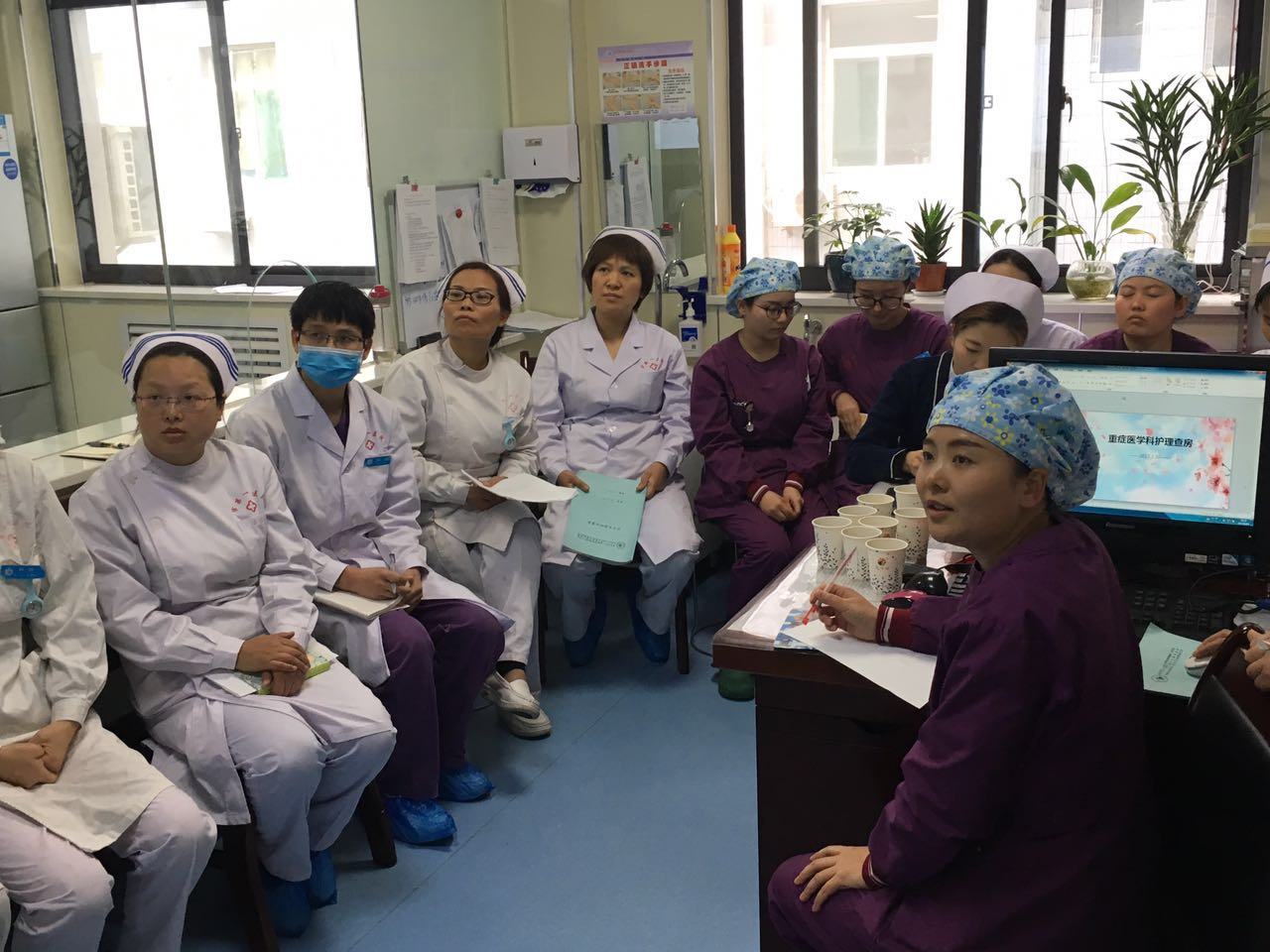 护理查房病例为女性,26岁,诊断为脑干出血、高血压3级(很高危),首先由重症医学科护士长刘红介绍了“脑干出血”的疾病概况,然后由该科责任护士杜欢对患者基本情况、治疗措施以及相关信息,汇报以PPT形式进行。在此过程中杜欢护士提出该患者的疑难护理问题,吸引在场不同层级的护士积极讨论发言并提出了护理措施方面的建设性意见,还有的护士表示可以帮助重症医学科解决降温毯等该患者急需的医疗设备。该患者因病情所需采取被迫体位,心血管总护士长齐银芝特别强调了预防压疮的重要性,并给出了固定头部,下半身30度垫起,使用气垫床可以相对延长翻身时间等护理措施;内科总护士长孙富英提出患者没有应激性溃疡的情况下,应尽早鼻饲进食,提高患者的抵抗力;大外科王卫妮、EICU赵敏、CCU张迪等老师都做了发言,对此次查房提出了宝贵的意见,使护理目标更加明确。各位护士长就大家的难点进行了解答。