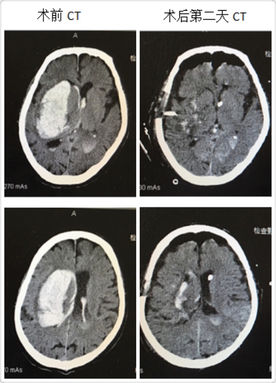 在王钢副主任医师的带领下,和麻醉科曹淑梅主任,杨克副主任一起,经过详细的术前讨论,制定周密的手术方案,急诊在全身麻醉下行脑出血小骨窗及神经内镜下清除血肿。手术十分顺利,手术历时2小时,骨窗大小直径约3cm,术中完全清除血肿,出血极少,术中未输血。术后第2天患者意识状态明显好转,由昏迷转为呼唤睁眼,出院时患者意识已经清醒,并且能够正常交流。