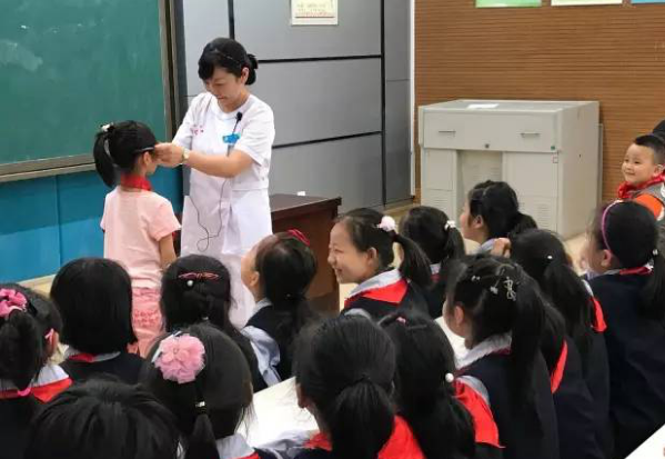 激光近视治疗中心护士长赵艳担任主讲人,走进校园,来到一年级小朋友们身边,用通俗诙谐的语言和严谨的医疗态度告诉他们——近视是如何形成的,我们该怎么做才能远离近视眼。