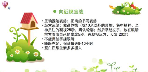 今年的6月6日爱眼日的主题是:“目”浴阳光,预防近视。对尚未近视的孩子来说,充分的户外活动,可以有效预防近视;而对已经近视的小孩来说,户外活动的保护则不明显。“这就是一个阀门,一旦打开了,近视就像洪水猛兽一样来了。”所以近视重在预防,一定要从小开始,在幼儿园阶段就要保证孩子有充分的户外活动时间,让孩子在空气新鲜、视野开阔的郊外远眺,极目欣赏祖国的山河大地。除此以外,小朋友一定要“节约用眼”,禁用手机、平板电脑等电子产品,不宜过早开发孩子的智力。