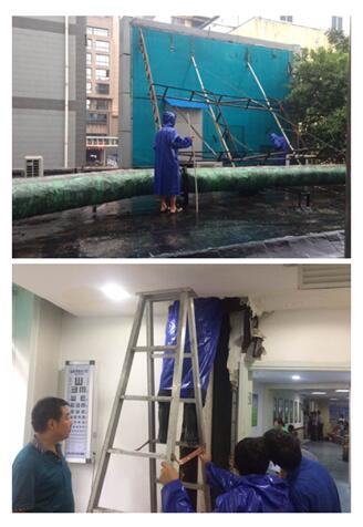 上午11时左右,眼科门诊急报19号检查室漏雨严重,需要尽快处理。院总务科维修组冒着大雨对漏水点进行勘查,为了不影响下午病人正常就诊,维修人员加班对漏水点进行抢修。由于雨势猛烈,每个人几乎都被雨水浇透了。终于赶在13:30前,及时完成了破损管道的修复。