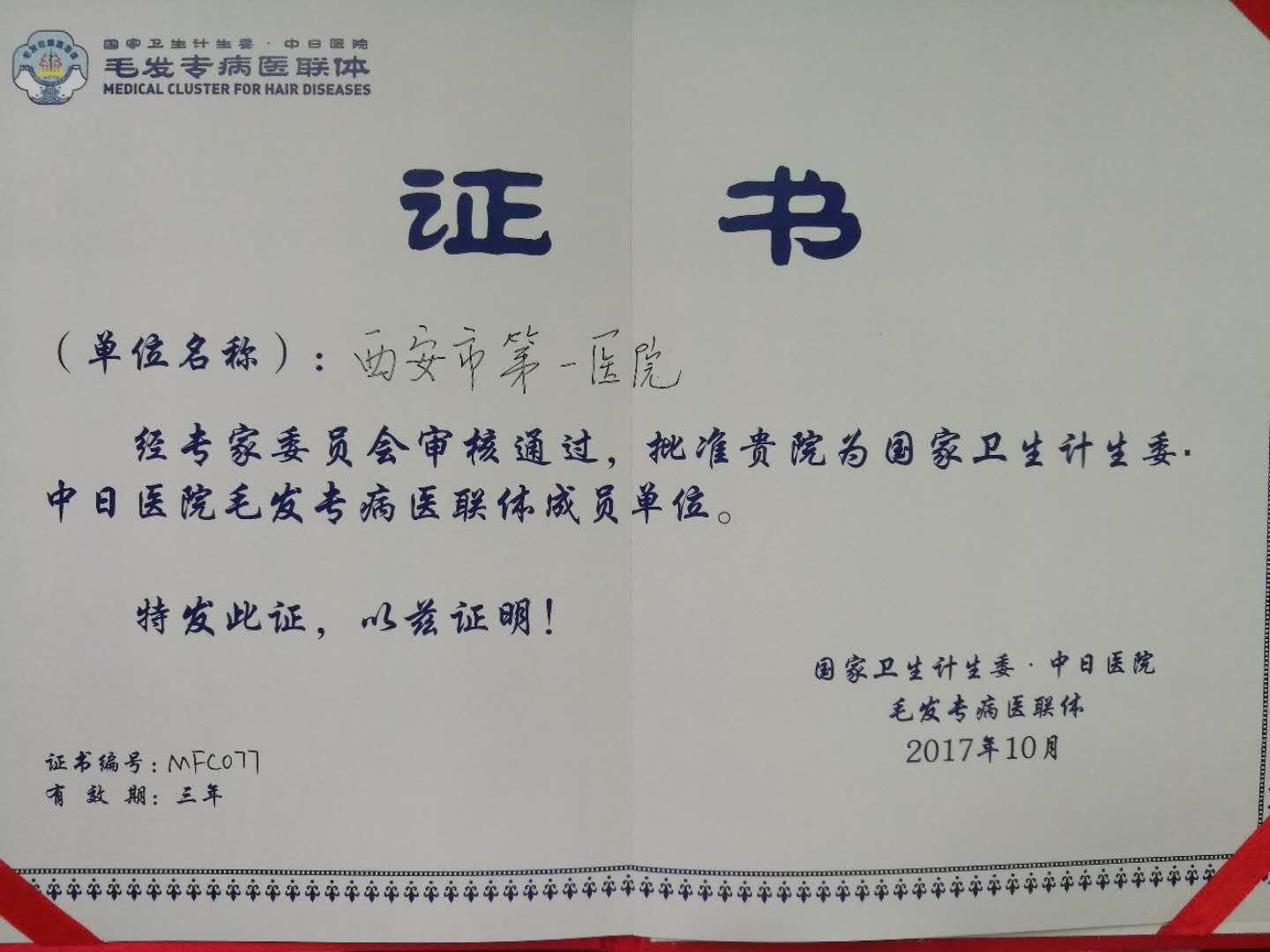 我院成为毛发专病医联体单位,是初次尝试参与毛发专病跨省分级诊疗的实践,有了与具有优势专科医院合作的契机,与中日友好医院的毛发医学中心建立了垂直联系;通过专病医联体广泛收集毛发专病病例,建立统一规范的数据资料,在病例资源统一共享的基础上,我院将会学到更多的诊疗经验,进而提高了皮肤科医生对毛发疾病的诊疗水平及其对毛发疾病的科研能力,进一步加强了毛发疾病的学科建设;若遇疑难病例,可为患者提供中日友好医院专家“毛发疑难疾病远程会诊”或“疑难疾病程会诊”的指导,使患者享受到更精准的治疗,获得科学、便捷、经济、高效、连续的医疗照护。开启了毛发疾病预防、治疗、康复、科研等一体化诊治新模式。本次毛发专病医联体大会经会务组层层筛选、结合医院的行业影响力及区域性,在陕西省上百家二级甲等以上级别的医院中,我院和西安交通大学第一附属医院、陕西省中医研究院共三家医院被批准为“毛发专病医联体”成员单位。