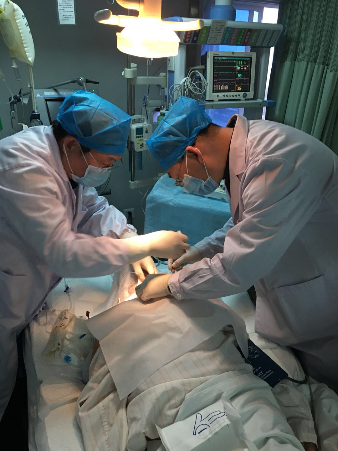 到达现场后,两位专家仔细检查患者,组织现场会诊,由于患者呈昏迷状态,针对颅脑损伤调整治疗方案,更重要的是患者颈部粗短、脊柱畸形、肺部感染等多方面原因导致通气不畅,氧分压降低,所以必须立即进行气管切开术,征得家属同意后,在短短15分钟,就手术完成,顺利打开气道,氧分压上升,患者病情改善,为进一步抢救患者奠定了基础。