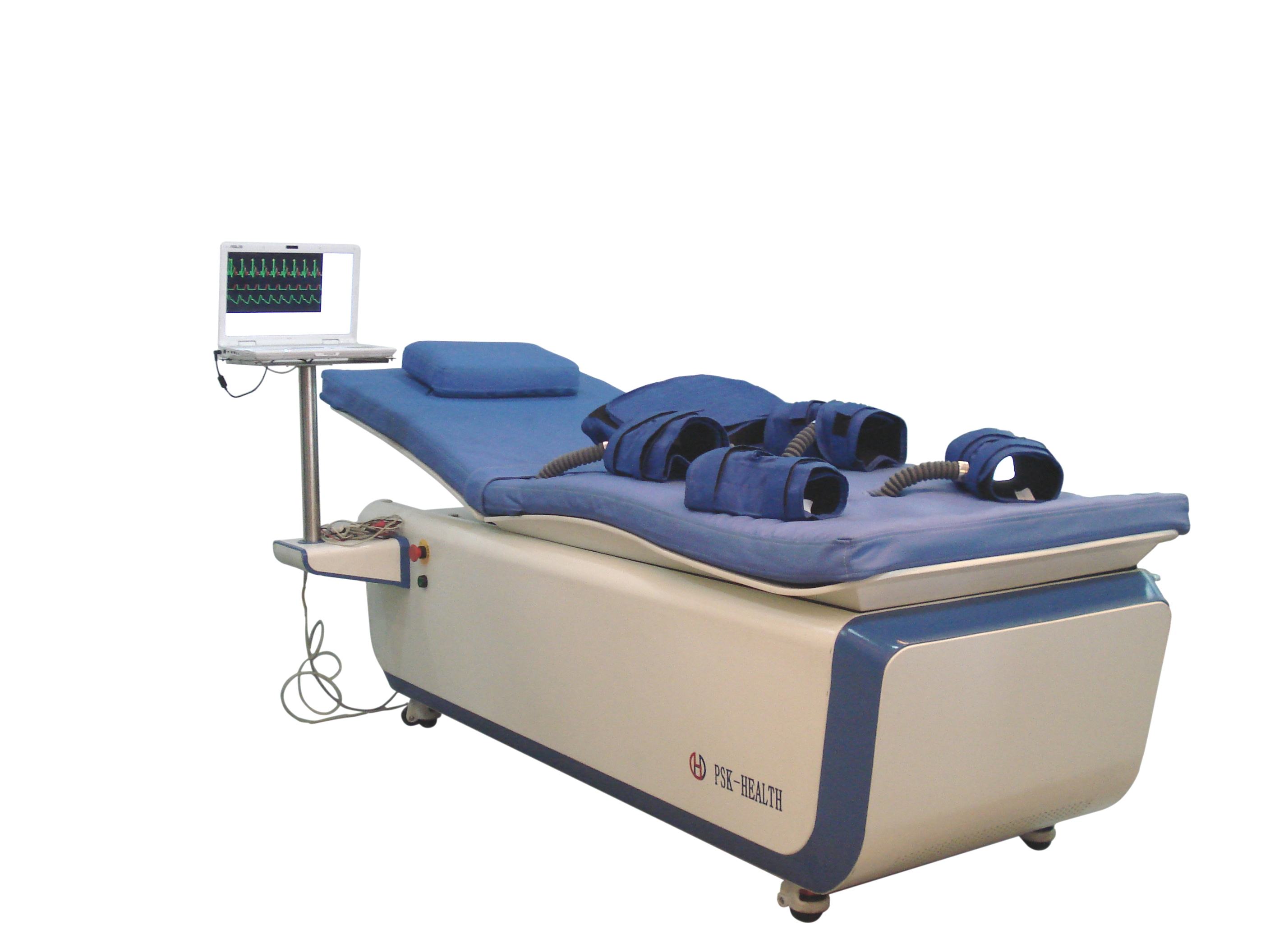 它的工作原理为在人体下肢和臀部裹以特制的气囊套,以心电R波为触发信号,在心脏舒张期,气囊由远及近序贯加压,驱动下肢血液向主动脉反流,提高主动脉舒张压,从而改善心脏、大脑等重要器官的血液供应;在心脏收缩期前,气囊迅速排气,受压的肢体血管开放,使主动脉收缩压下降,从而减少外周循环阻力,减轻心脏后负荷。减少血小板聚集,降低血栓素水平,达到改善血管内皮功能和血液循环的目的。