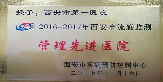 属陕西省卫生计生委授牌的国家级流感监测哨点医院,负责流感样病例的监测工作。西安市疾病预防控制中心按照国家流感监测工作方案对我市五家流感监测哨点医院进行考核评定后,授予我院“2016-2017年西安市流感监测管理先进医院”称号。