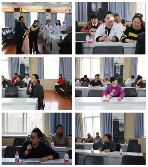 患者和家属代表们非常高兴有这样一个平台,能和院方进行面对面零距离的沟通。大家对我院各方面给予了充分肯定:“医院的医疗技术好,医护人员服务态度好、工作认真负责”、“医生医德高尚,护士待患者如家人”。特别是一些老病号,切实感受到了医院在改善医疗服务方面所做的努力。一位来自宁夏的年青女患者因左眼碱烧伤在眼六病区住院,当她再次回忆起这段经历时几度哽咽,当时的她非常害怕,担心失明,马挺主任、汪玲副主任的鼓励和安慰使我能积极接受治疗,护士长带领护士姐姐们在床位非常紧张的情况下,想方设法给我调床位,经过医护人员的精心治疗和细心护理,我的视力已基本恢复,她用最朴实的语言表达了对医院的感恩之情。还有一位来自神经内科的患者,身患糖尿病、高血压、脑梗等多种疾病,十年间在我院多科室就诊住院数次,今天在神经内科护士的陪同下坐着轮椅来到会场。她激动的告诉大家:“十年了,我今天终于可以站起来了,你们谁都不用扶我,也不用拐杖,我现在就能站起来!我自己走!”。并一一细数她在多次住院中遇到的好医生、好护士的名字:葛兴利、李延、任自才、孙富英、任燕萍、刘红娟、马挺、刘旭、周瑞堂、刘伟民……。参会患者和家属代表根据自己的就医体验,积极发言,认真填写满意度调查表,对改善我院住院环境和服务流程等方面提出了一些中肯、富有建设性的意见和建议。