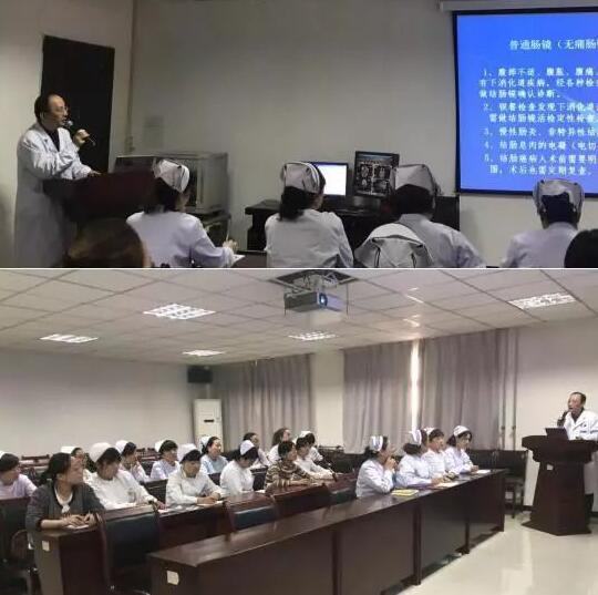 韦斌主任从结肠镜检查的适应症、禁忌症及结肠镜检查前后的注意事项讲起,着重讲述了结肠镜检查治疗前后护理工作要点,强调了医护合作的重要性。并展示了在清洁良好的肠道准备前提下,运用电子放大结肠镜新技术发现的几例消化道早癌病例图片。约一个小时的讲座贯穿讲解、提问、互动等几个环节,会议气氛热烈而活跃。