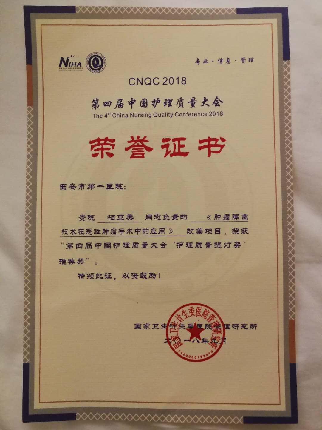 护理部、手术室的改善项目“肿瘤隔离技术在恶性肿瘤手术中的应用”荣获“护理质量提灯奖”“推荐奖”,护理部任燕萍主任、手术室相亚美护士长赴青岛领奖。