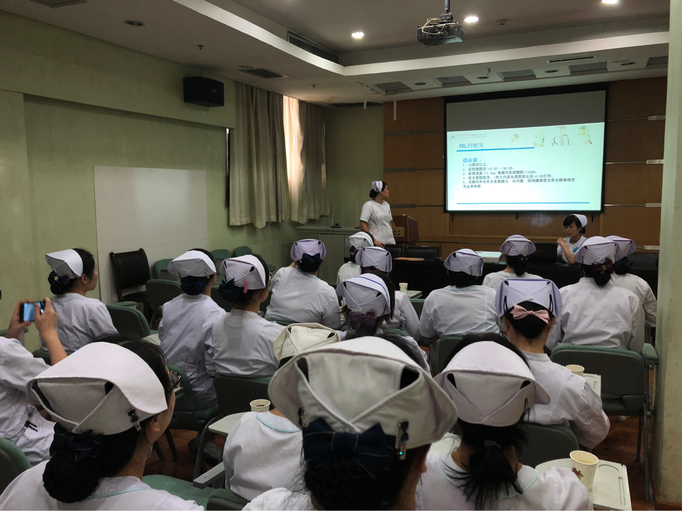 查房环节,责任护士吴春艳汇报该病例患者女性,31岁,双眼高度近视10余年,床旁眼科查体及护理评估之后她以PPT形式对患者基本情况、治疗、主要护理问题及措施、健康教育予以介绍。陈莹护士为大家知识链接了PRL手术的优点及与传统手术的区别,就健康教育的优化项目提出创新观点和措施。讨论中,大家踊跃发言,通过交流和学习逐步揭开PRL手术的“神秘面纱”。