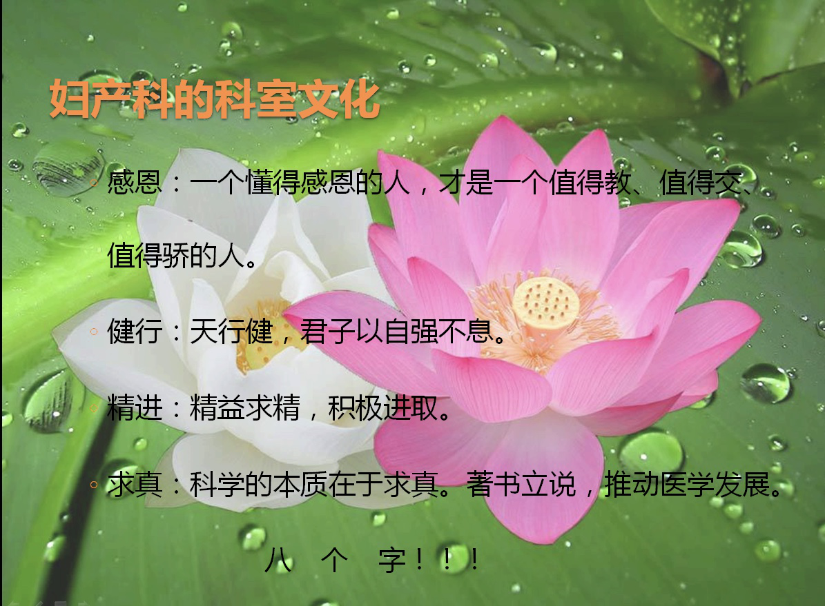 针对妇产科目前现状,宋主任以“感恩、健行、精进、求真”这八个字作为目前科室文化的主要体现。