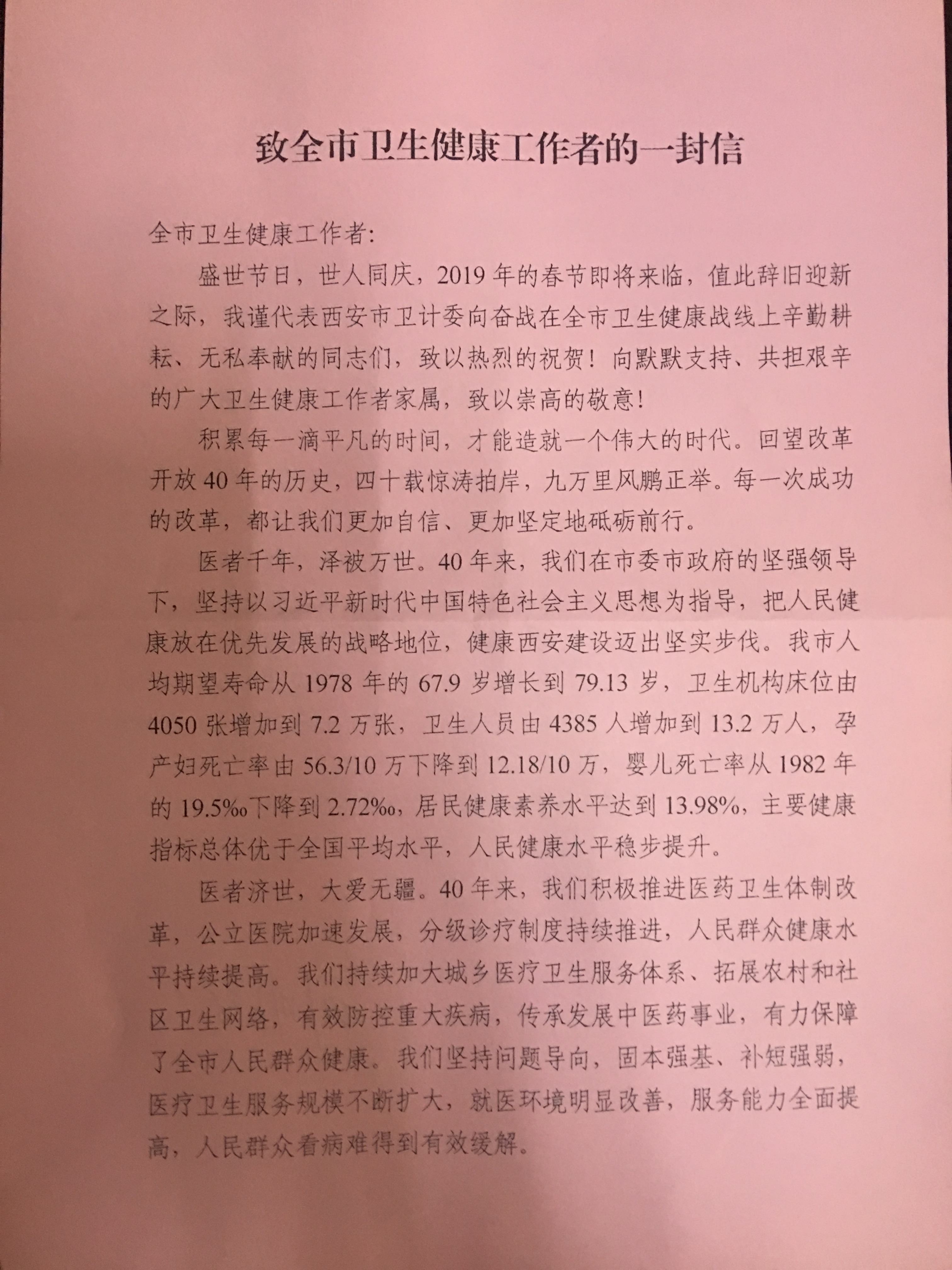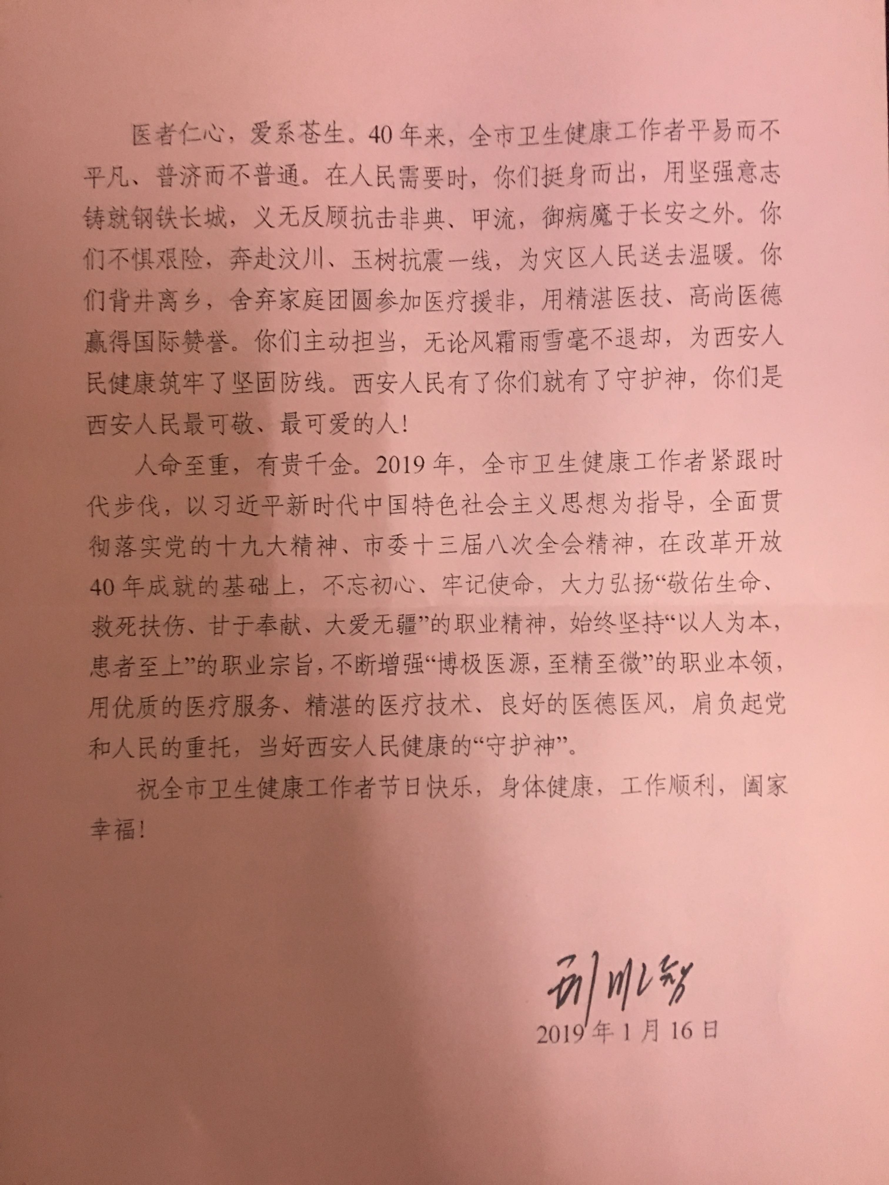 市卫计委党委书记、主任刘顺智致全市卫生健康工作者的一封信