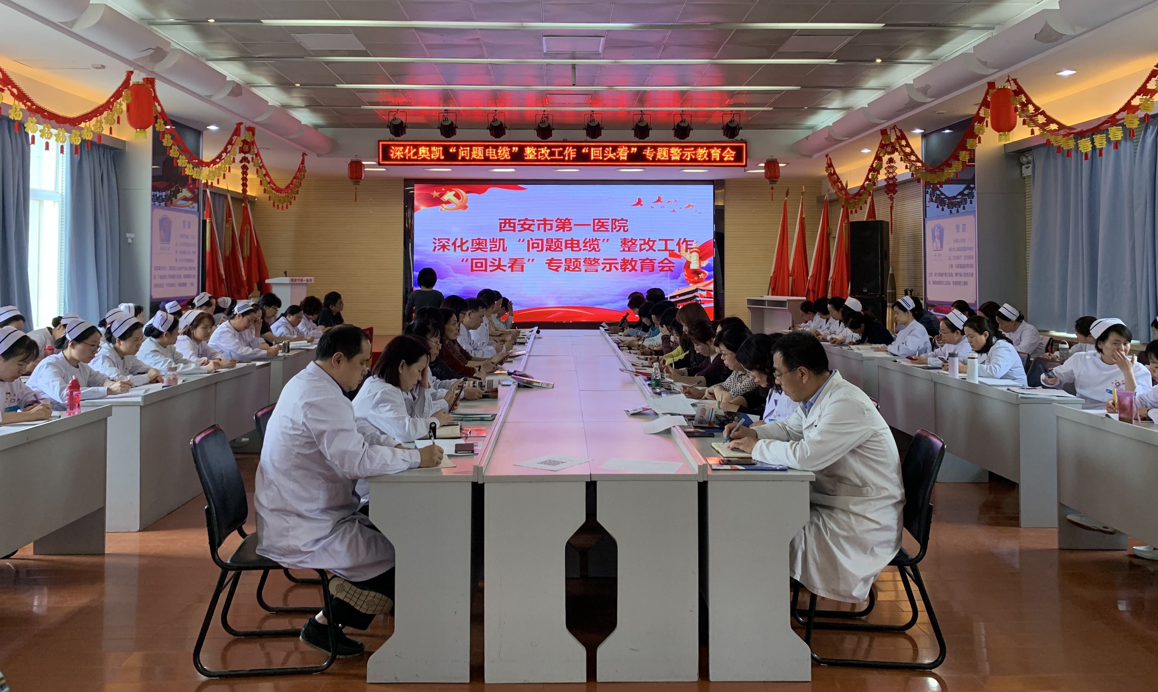 召开深化奥凯“问题电缆”整改工作“回头看”专题教育学习会,院领导班子及全院中层干部参加会议。会上党委书记邢海柱传达市卫建委关于“奥凯问题电缆”专题警示教育方案精神,纪委书记白敏芳带领大家对“奥凯问题电缆事件”始末进行回顾,原原本本对国务院办公厅关于西安地铁“问题电缆”事件调查处理情况及其教训的通报进行传达,并就事件产生原因及重要启示进行学习。