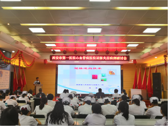 心血管病医院冠脉夹层病例研讨会》,会议特邀陕西省人民医院张勇教授、西安交通大学第一附属医院王军教授、西安交通大学第二附属医院邓捷教授莅临授课及点评、特邀临潼区医院心内科高新明主任,及心血管病医院全体医护人员参加。