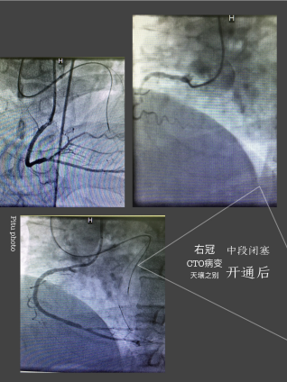 我科于2019年10月14日收入院1位男性患者,以“间断胸闷、气短5年”主诉入院,5年前冠脉CTA提示右冠状动脉严重狭窄,1月前冠脉CTA结果提示:右冠闭塞。近来心绞痛频繁发作,程度加重,因此住院准备冠脉介入治疗。入院后全科进行危重病例讨论:结合患者冠脉CTA结果,考虑患者右冠闭塞为CTO病变,难度大,制定手术方案:首先尝试正向开通,如果不顺利及时调整为逆向开通方案。