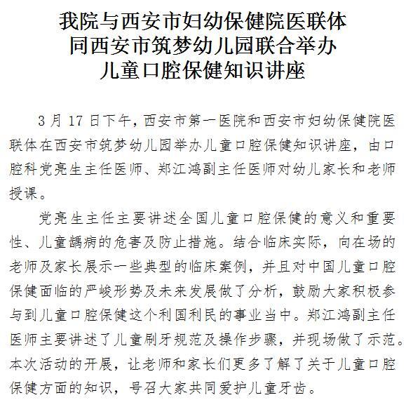 我院与市妇幼保健院医联体同西安市筑梦幼儿园联合举办儿童口腔保健知识讲座