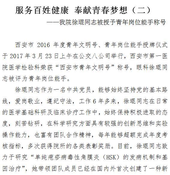 服务百姓健康 奉献青春梦想(二) ——我院徐琨同志被授予“青年岗位能手”称号