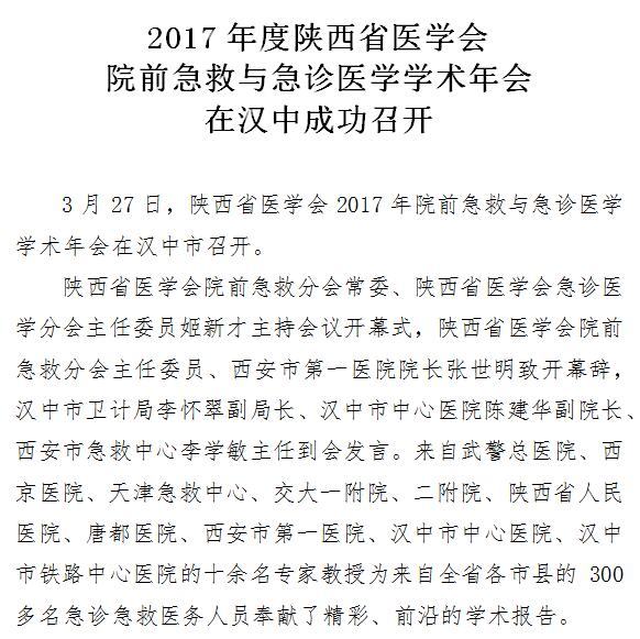 2017年度陕西省医学会院前急救与急诊医学学术年会在汉中成功召开