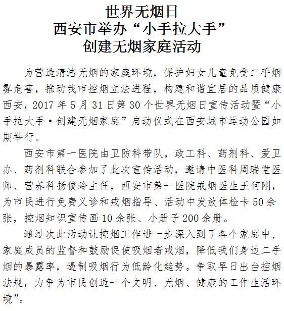 西安市举办世界无烟日“小手拉大手”创建无烟家庭活动