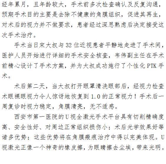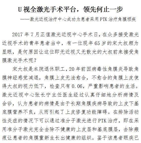 U视全激光手术平台,领先何止一步 ——激光近视治疗中心成功为患者采用PTK治疗角膜顽疾