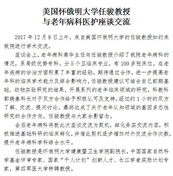 美国怀俄明大学任骏教授与老年病科医护座谈交流
