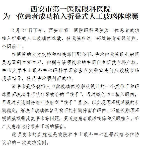探花av 眼科医院为一位患者成功植入折叠式人工玻璃体球囊