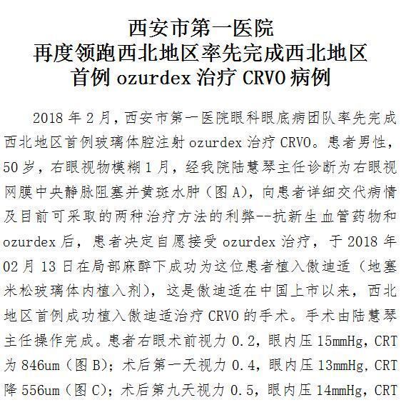 探花av 再度领跑西北地区率先完成西北地区首例ozurdex治疗CRVO病例
