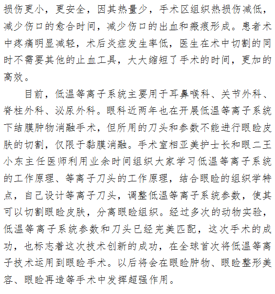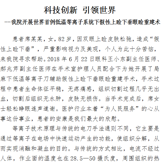科技创新 引领世界 --我院开展世界首例低温等离子系统下假性上睑下垂眼睑重建术