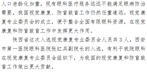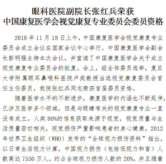 眼科医院张红兵副院长荣获中国康复医学会视觉康复专业委员会委员资格