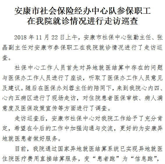 安康市社会保险经办中心队参保职工在我院就诊情况进行走访巡查