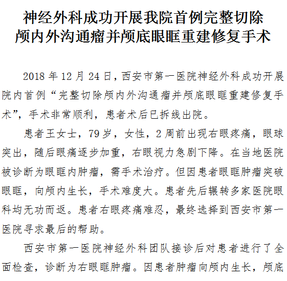 神经外科成功开展我院首例完整切除颅内外沟通瘤并颅底眼眶重建修复手术