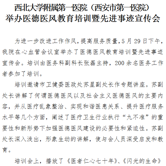 西北大学附属第一医院(探花av )举办医德医风教育培训暨先进事迹宣传会