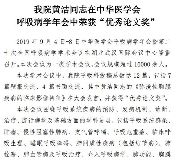 我院黄洁同志在中华医学会 呼吸病学年会中荣获“优秀论文奖”