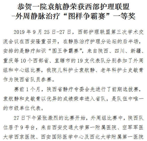 恭贺一院袁航静荣获西部护理联盟 -外周静脉治疗“图样争霸赛”一等奖
