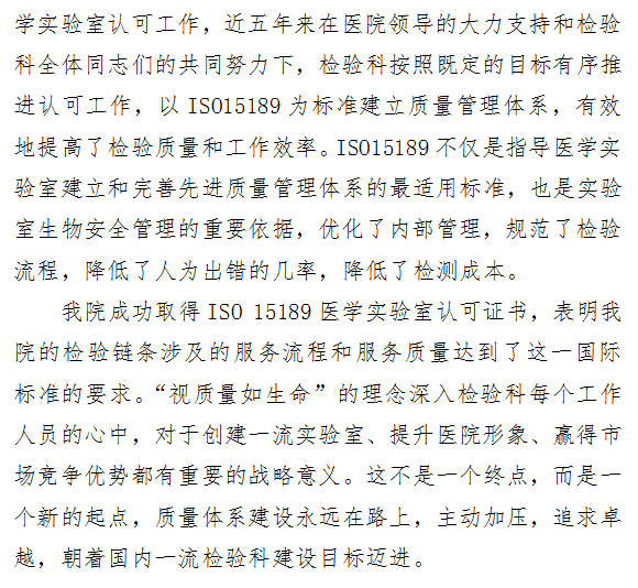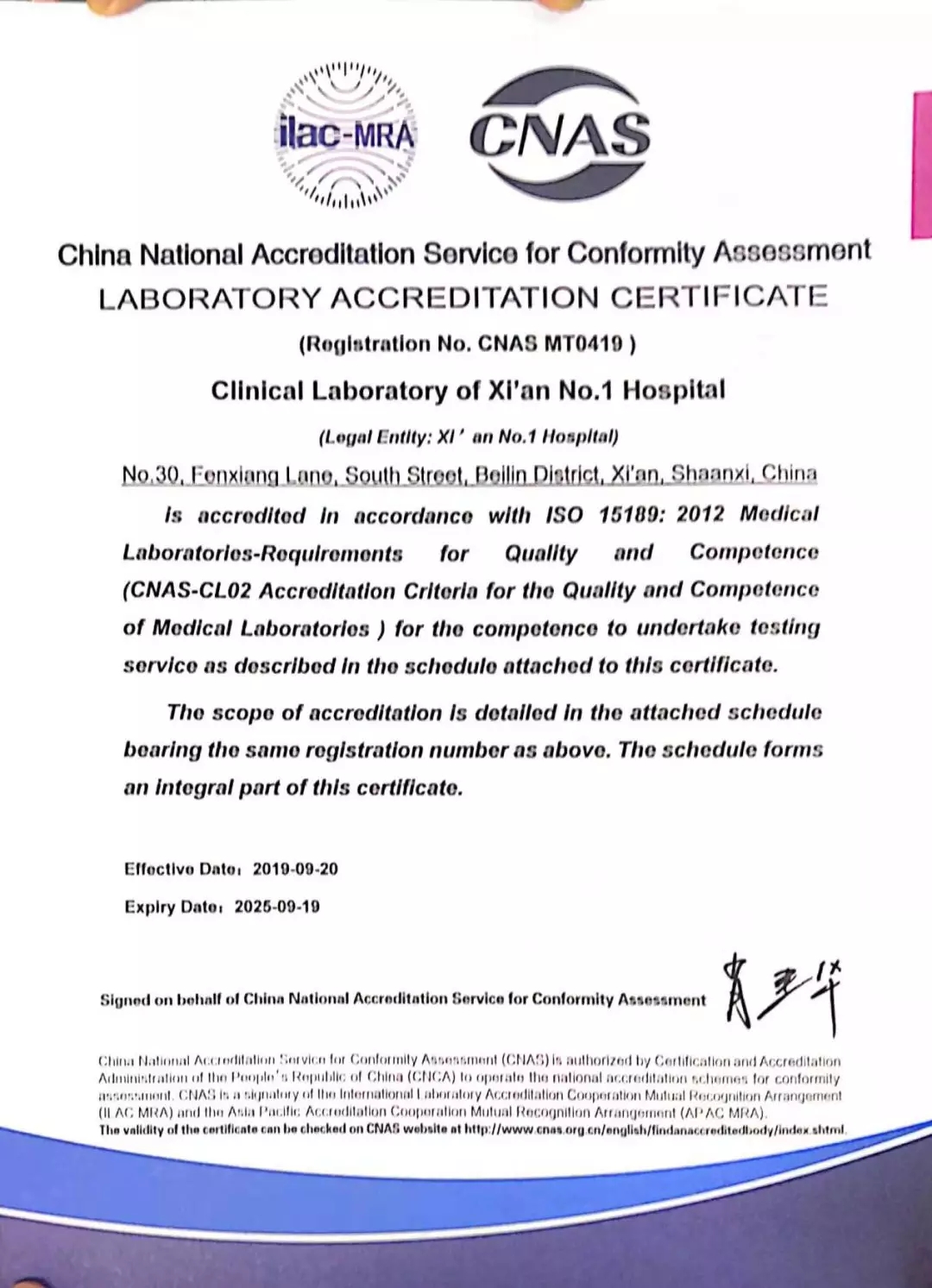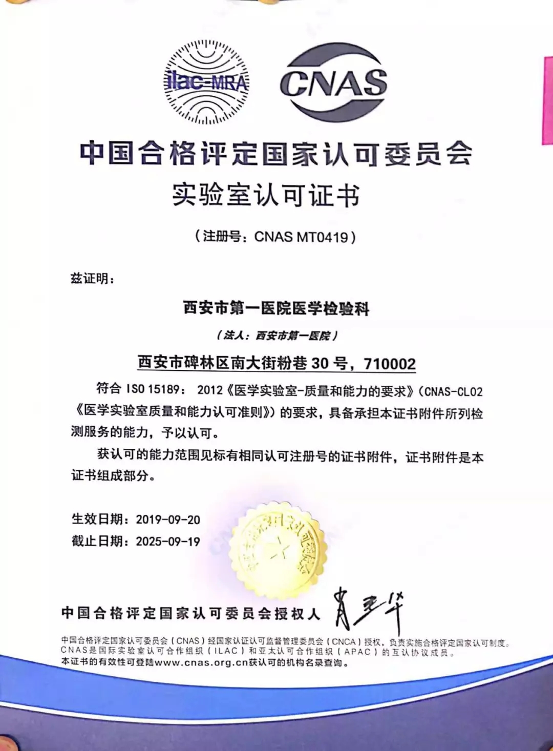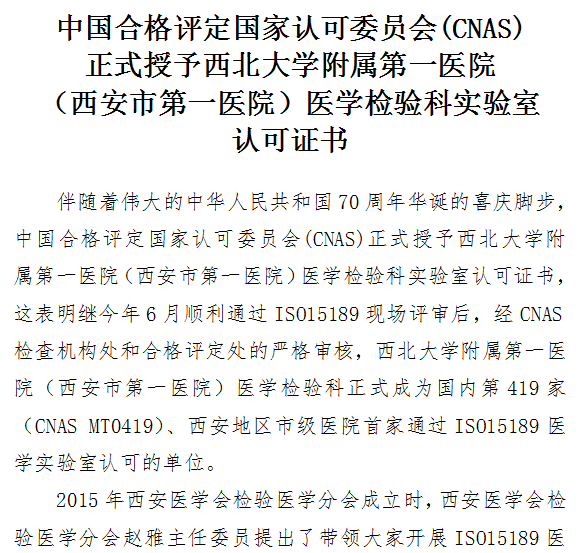 中国合格评定国家认可委员会(CNAS) 正式授予探花av 医学检验科实验室 认可证书