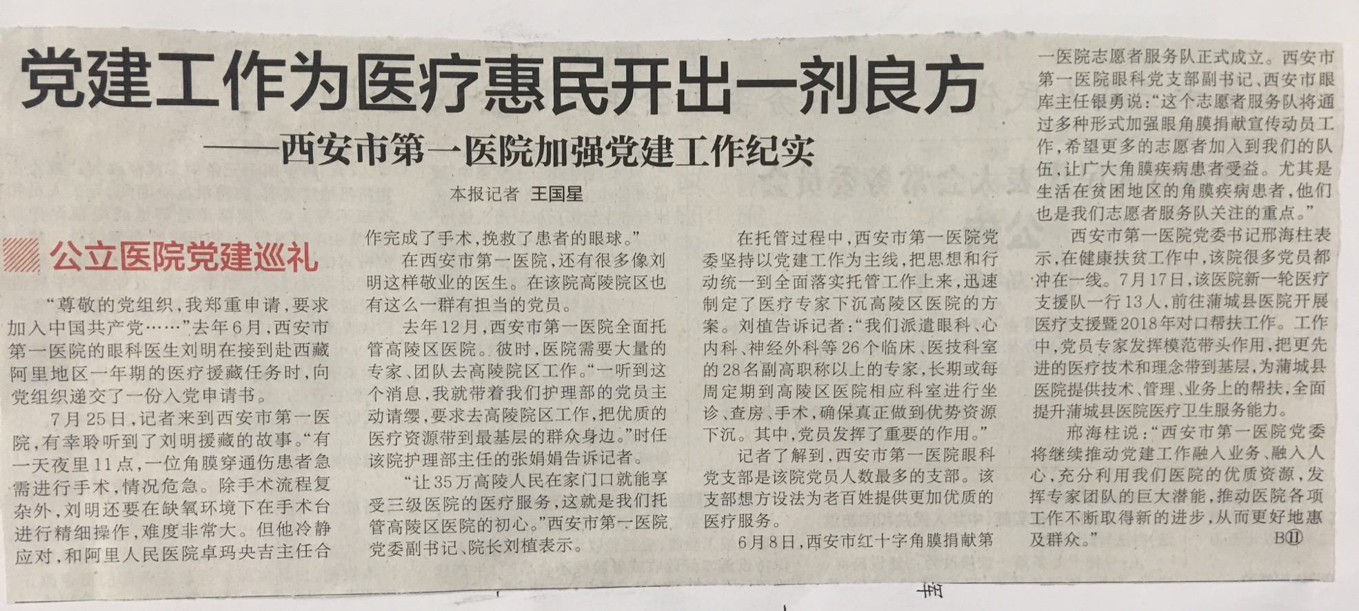 2018.8.8《陕西日报》党建工作为医疗惠民开出一剂良方