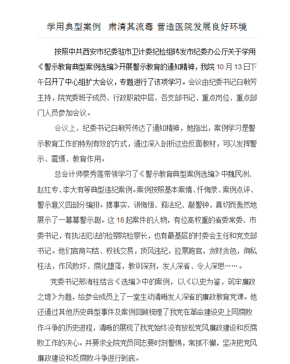 学用典型案例 肃清其流毒 营造医院发展良好环境