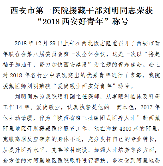 探花av 援藏干部刘明同志荣获“2018西安好青年”称号