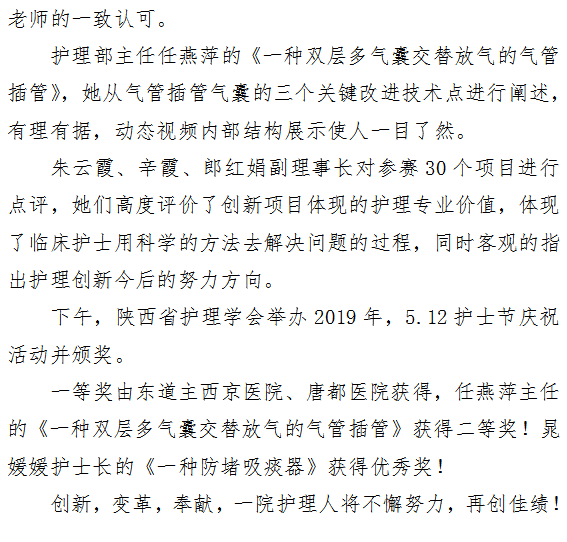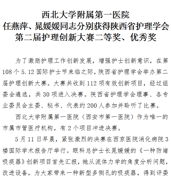 市一院任燕萍、晁媛媛同志分别获得陕西省护理学会 第二届护理创新大赛二等奖、优秀奖