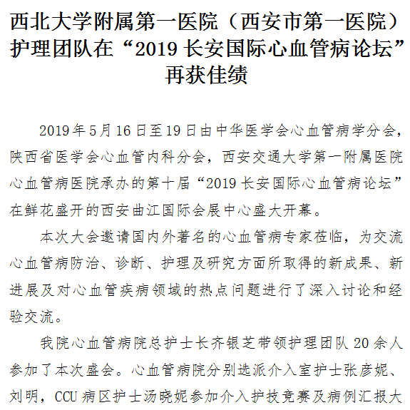 西北大学附属第一医院护理团队在“2019长安国际心血管病论坛”再获i佳绩
