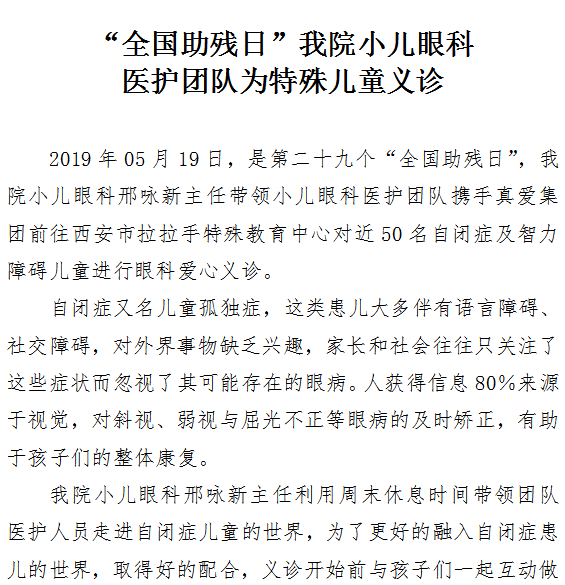 “全国助残日”我院小儿眼科医护团队为特殊儿童义诊