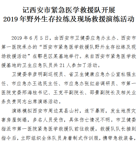 记西安市紧急医学救援队开展2019年野外生存拉练及现场救援演练活动
