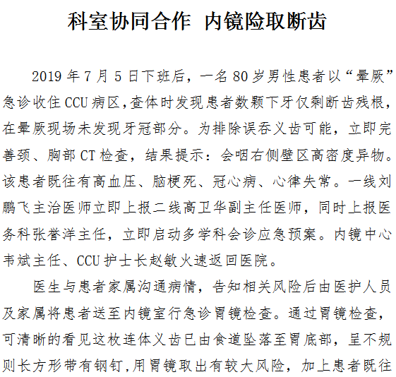 科室协同合作 内镜险取断齿