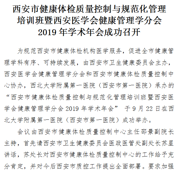 西安市健康体检质量控制与规范化管理培训班 暨西安医学会健康管理学分会2019年学术年会